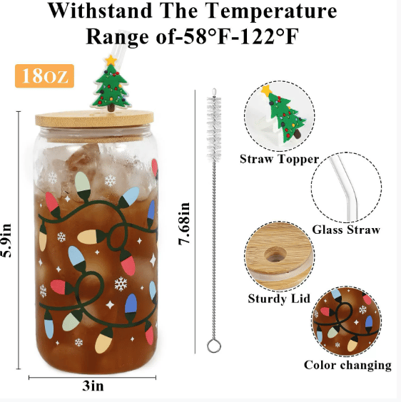 The perfect 18oz size for iced coffee. smoothies. cocktails. or holiday punches.Includes a reusable glass straw and adorable straw charm for extra festive flair.
